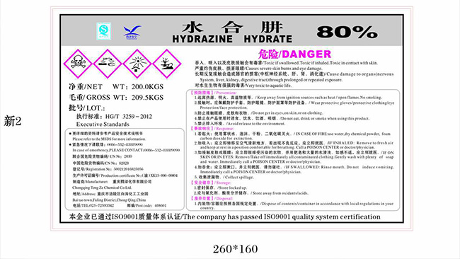 水合肼(肼:拼音:jǐng)又稱水合聯氨。純品為無色透明的油狀液體,有淡氨味,在濕空氣中冒煙,具有強堿性和吸濕性。常壓下,肼可以和水形成共沸(共沸物中肼含量約為69%)[1] 。工業上一般應用含量為40%--80%的水合肼水溶液或肼的鹽。水合肼液體以二聚物形式存在,與水和乙醇混溶,不溶于乙醚和氯仿;它能侵蝕玻璃、橡膠、皮革、軟木等,在高溫下分解成N2、NH3和H2;水合肼還原性極強,與鹵素、HNO3、KMnO4等激烈反應,在空氣中可吸收CO2,產生煙霧。水合肼及其衍生物產品在許多工業應用中得到廣泛的使用,用作還原劑、抗氧劑,用于制取醫藥、發泡劑等。